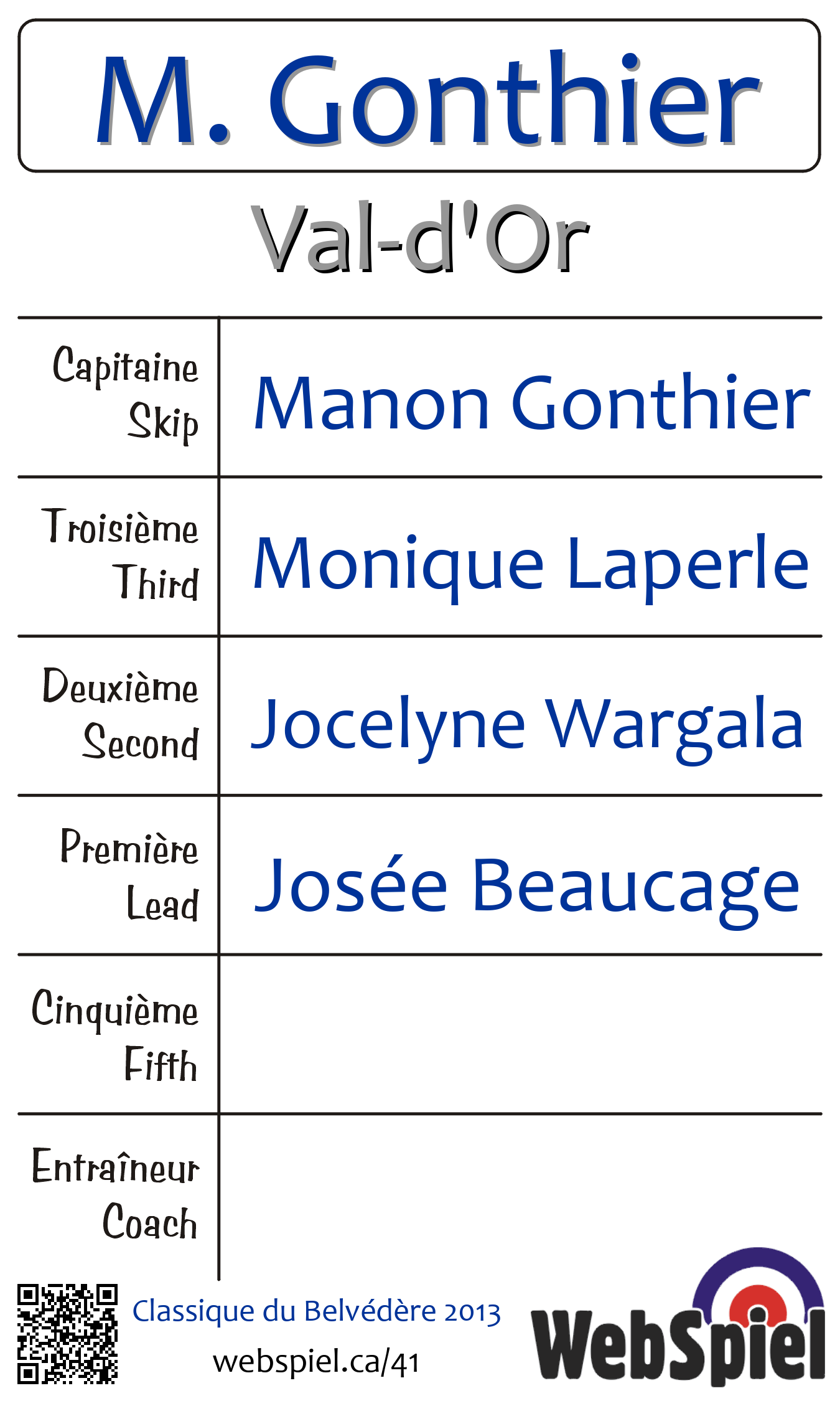 Samedi le 9 février 2013, à 15h30 EST Club de curling du Belvédère, Glace 1 · A, Gagnant › F16, Perdant › Éliminé | ||||||||||