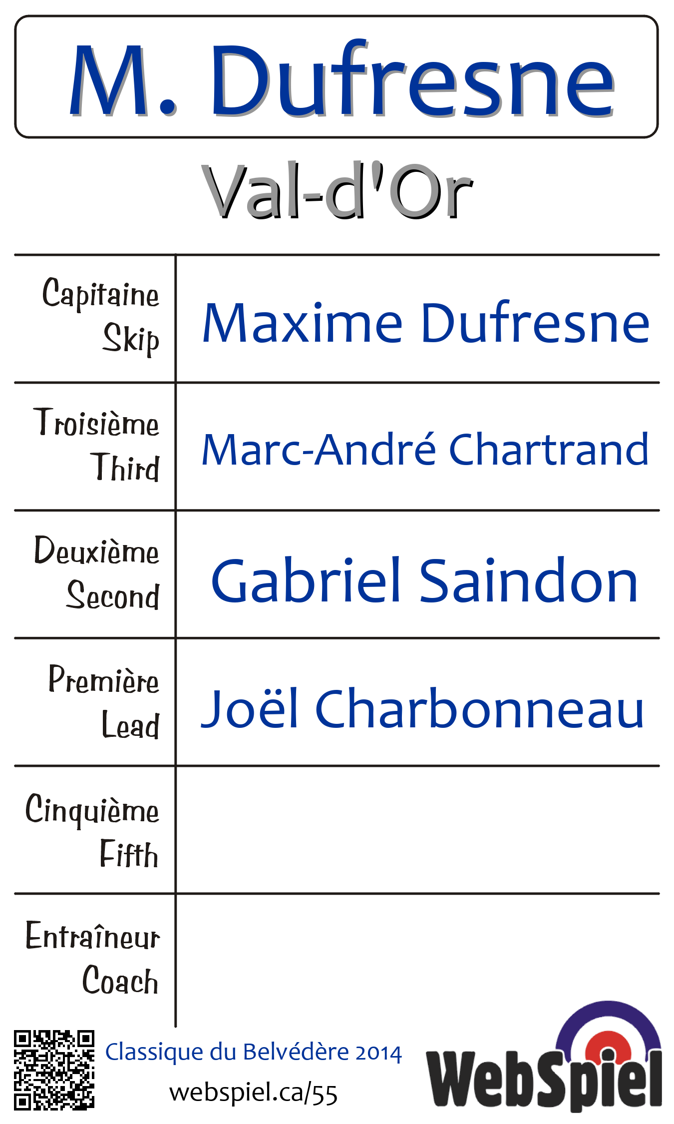 Vendredi le 14 février 2014, à 19h45 EST Club de curling du Belvédère, Glace 4 · D, Gagnant › A19, Perdant › C01 | |||||||||