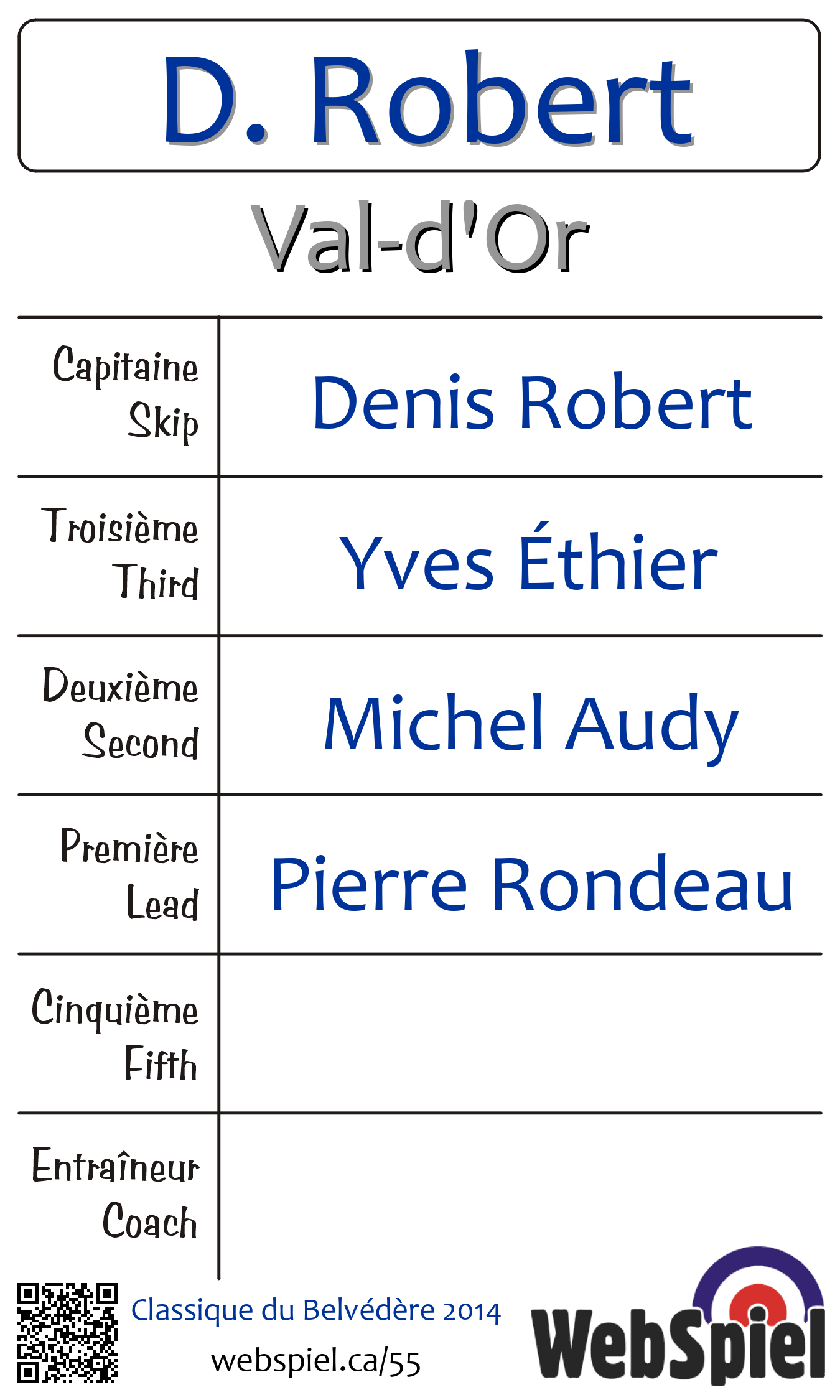 Vendredi le 14 février 2014, à 17h45 EST Club de curling du Belvédère, Glace 2 · B, Gagnant › A31, Perdant › B02 | |||||||||