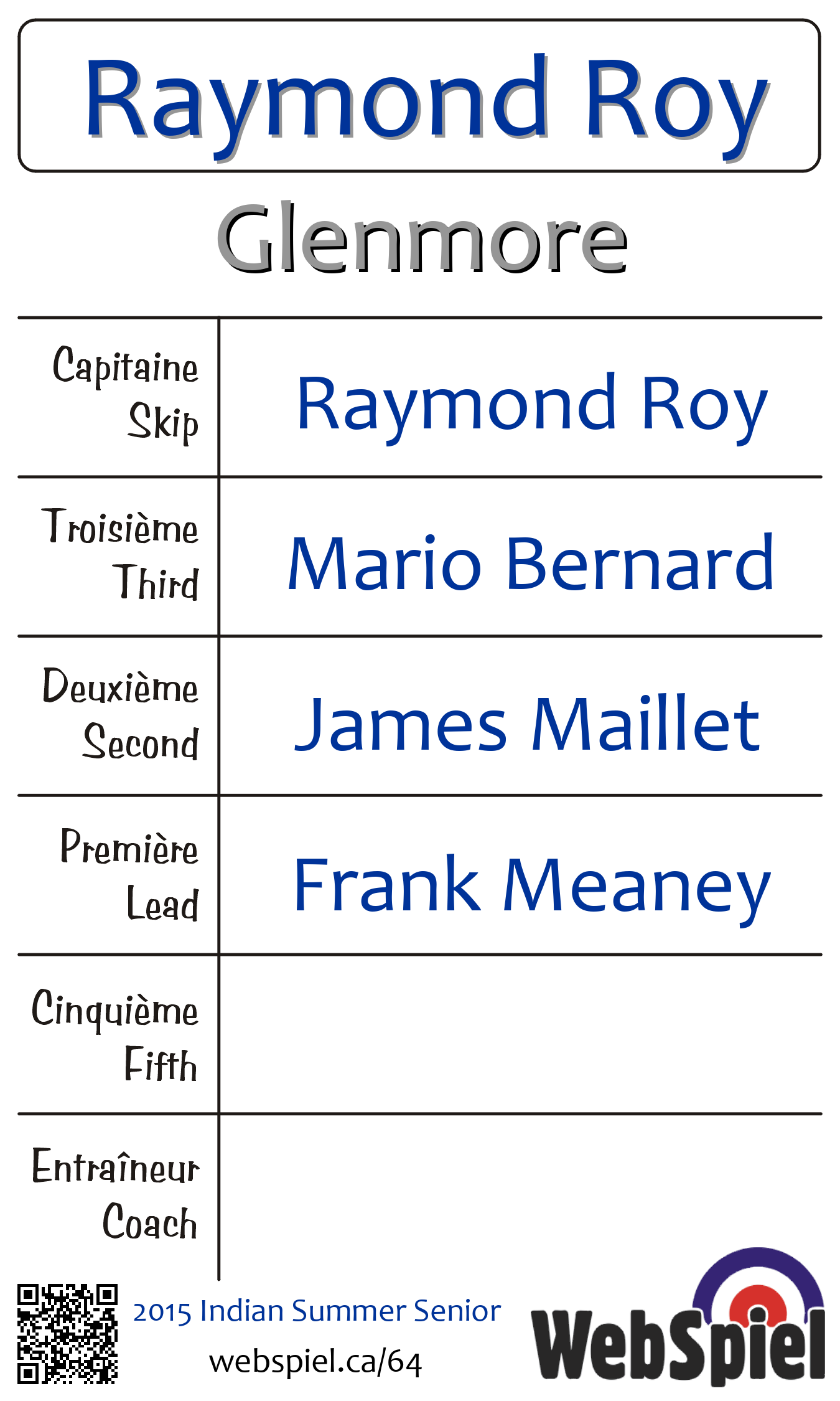 Jeudi le 8 octobre 2015, à 19h00 EDT Glenmore Curling Club, Glace 214, Gagnant › A16, Perdant › B04 | |||||||||