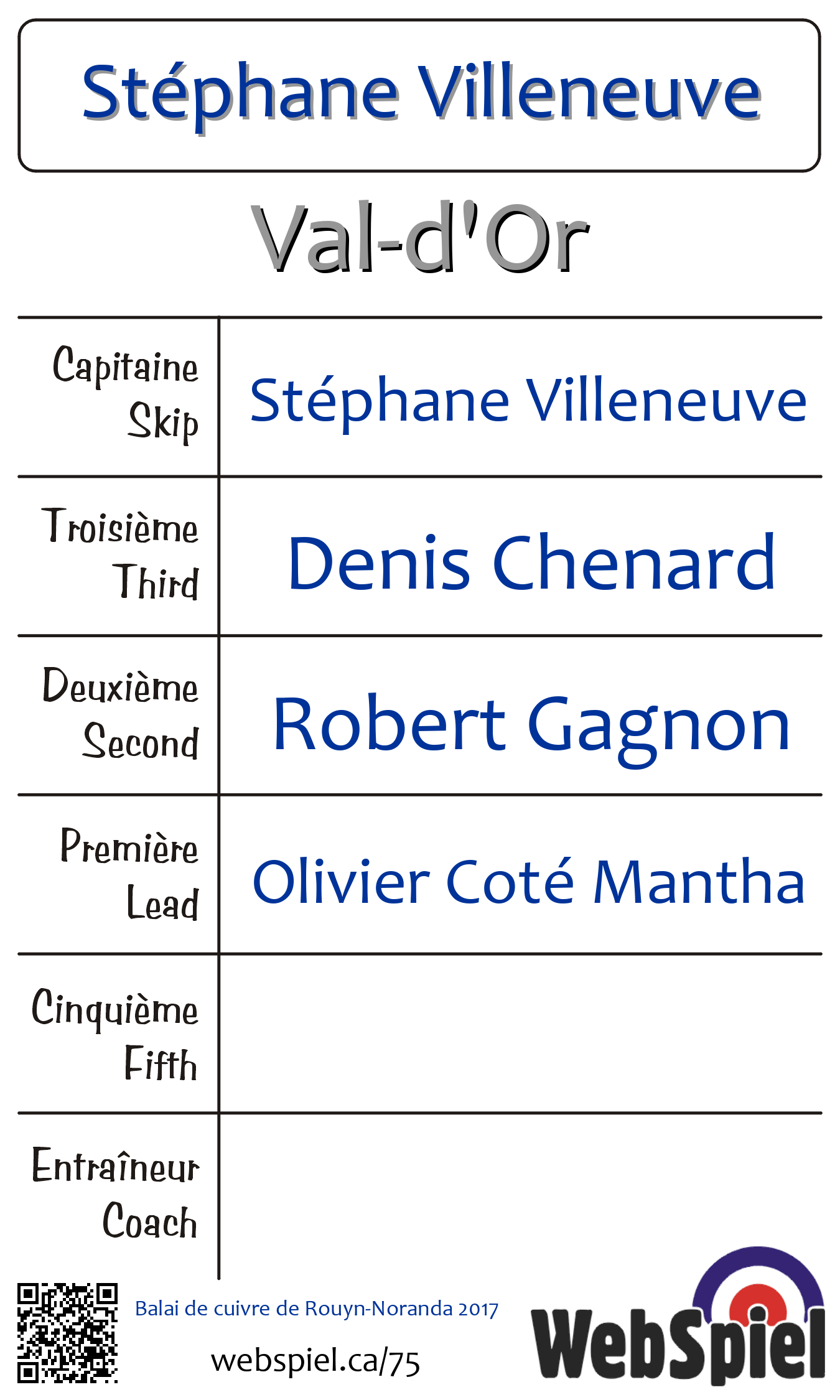 Vendredi le 10 mars 2017, à 21h00 EST Club de curling Noranda, Glace 3 · C, Gagnant › A52, Perdant › C22 | ||||||||||