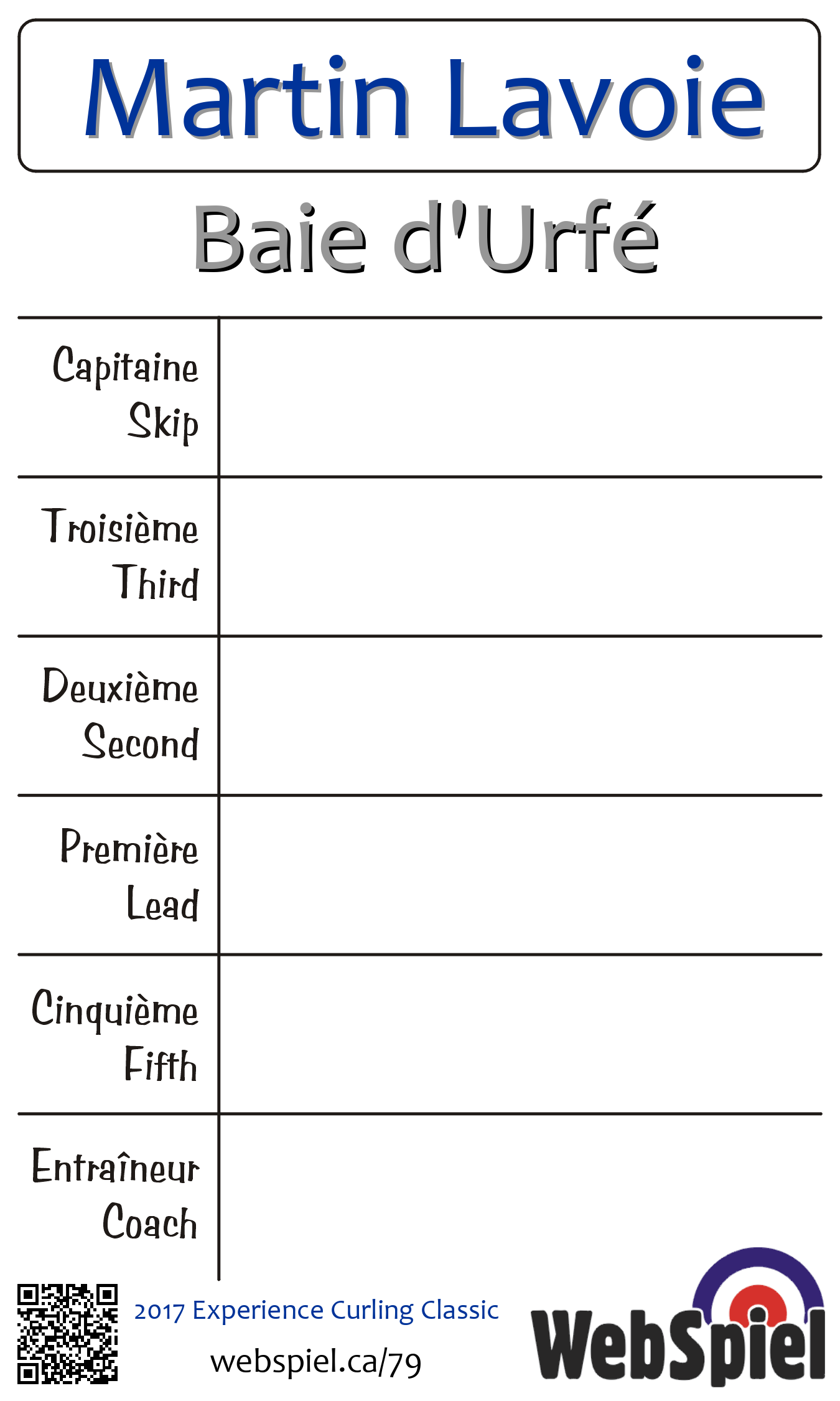 Vendredi le 10 novembre 2017, à 18h30 EST Baie d'Urfé Curling Club, Glace 193 | |||||||||