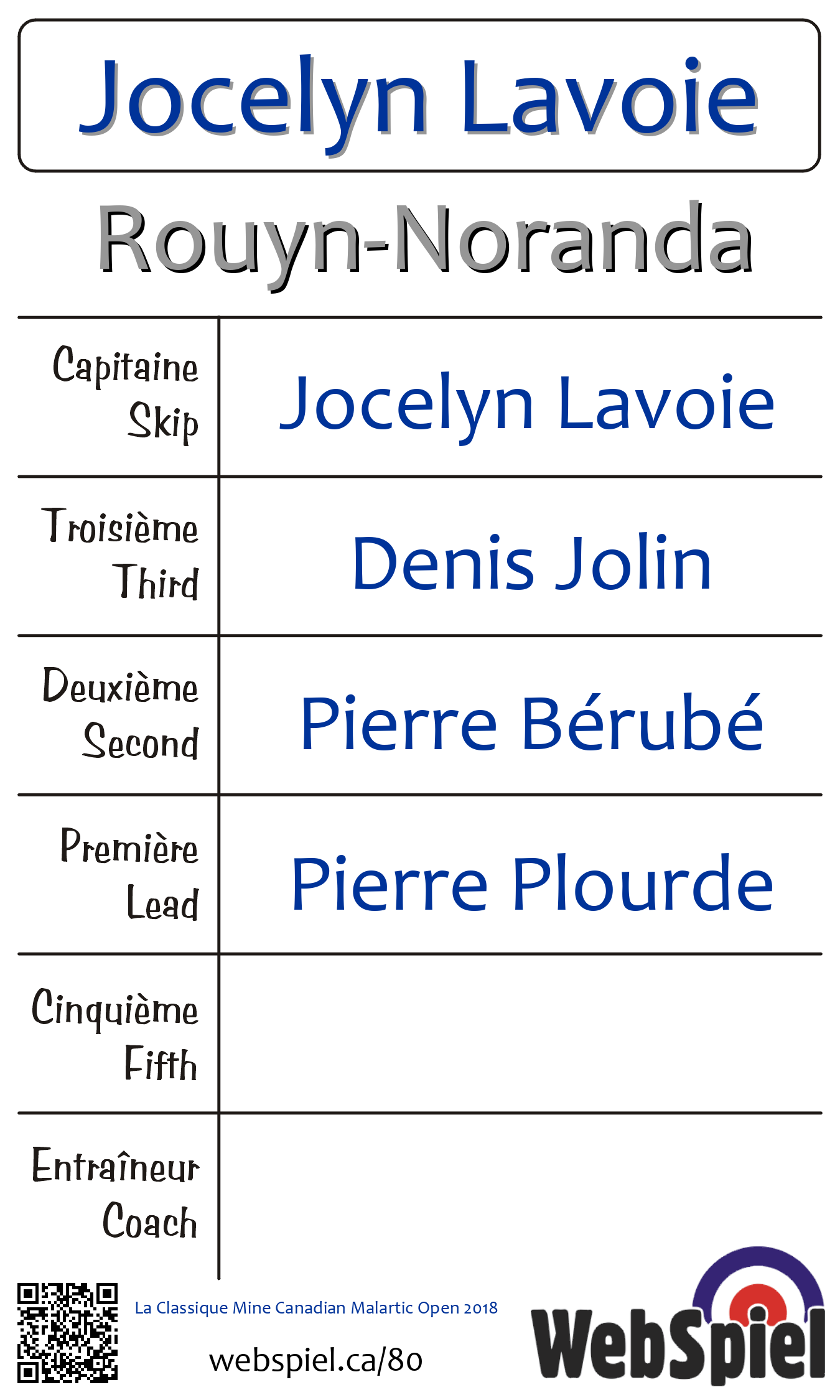 Dimanche le 4 février 2018, à 8h00 EST Club de curling du Belvédère, Glace 3 · C, Gagnant › B06, Perdant › Éliminé | |||||||||