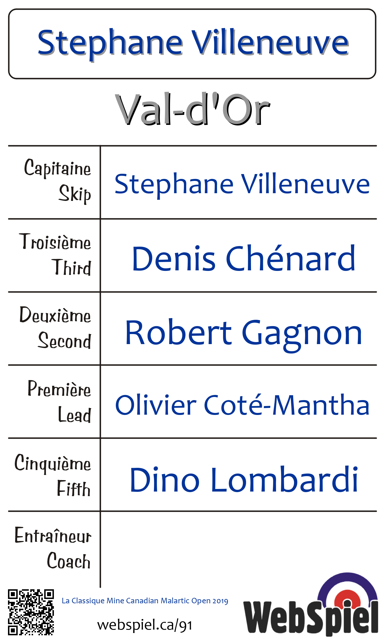 Jeudi le 14 février 2019, à 19h00 EST Club de curling du Belvédère, Glace 4 · D, Gagnant › A24, Perdant › C04 | |||||||||