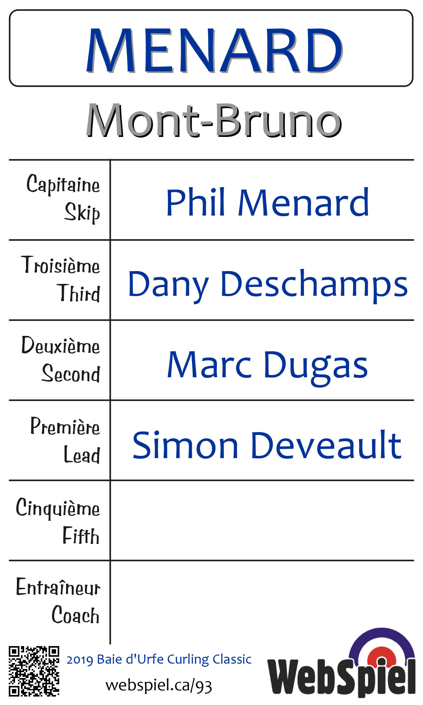 Vendredi le 25 octobre 2019, à 21h30 EDT Baie d'Urfé Curling Club, Glace 193 | |||||||||